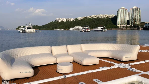 The Yachtbeach Sofa is a special supplement to the Yachtbeach luxury line – an inflatable Air Sofa, with 2 separate air combs that is pumped up fast and easily. The corner sofa fits perfectly on all YACHTBEACH platforms but also on every other platform. Simple fixed with 4 straps. Due to the high-quality material, the sofa can also be used in the garden, in the pool or on the terrace. Easy to stow, it can be quickly set up everywhere.