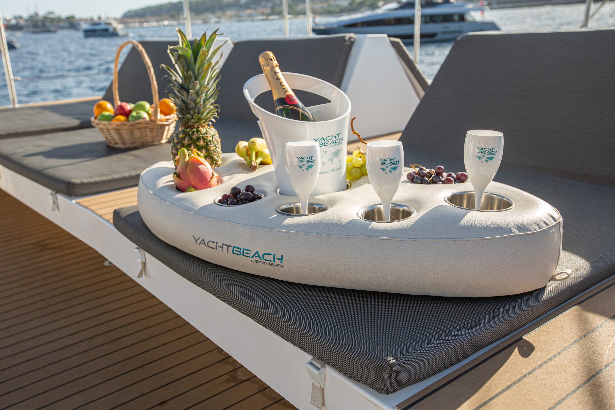 Yachtbeach – floating cup holder The Yachtbeach Floating Cup Holder is simply a part of a relaxing day on the water. It offers enough space for glasses, cans, bottles or other drinks. When you open the zipper you get to the valve and you can easily inflate the cup holder. Thanks to the loaded artificial marine leather, it is very UV resistant and highly resistant in terms of scratches. It is very easy to clean and the 11 cup holders are made of real stainless steel. Detailed information: Material: artificial navy leather 11 stainless steel drink holders
